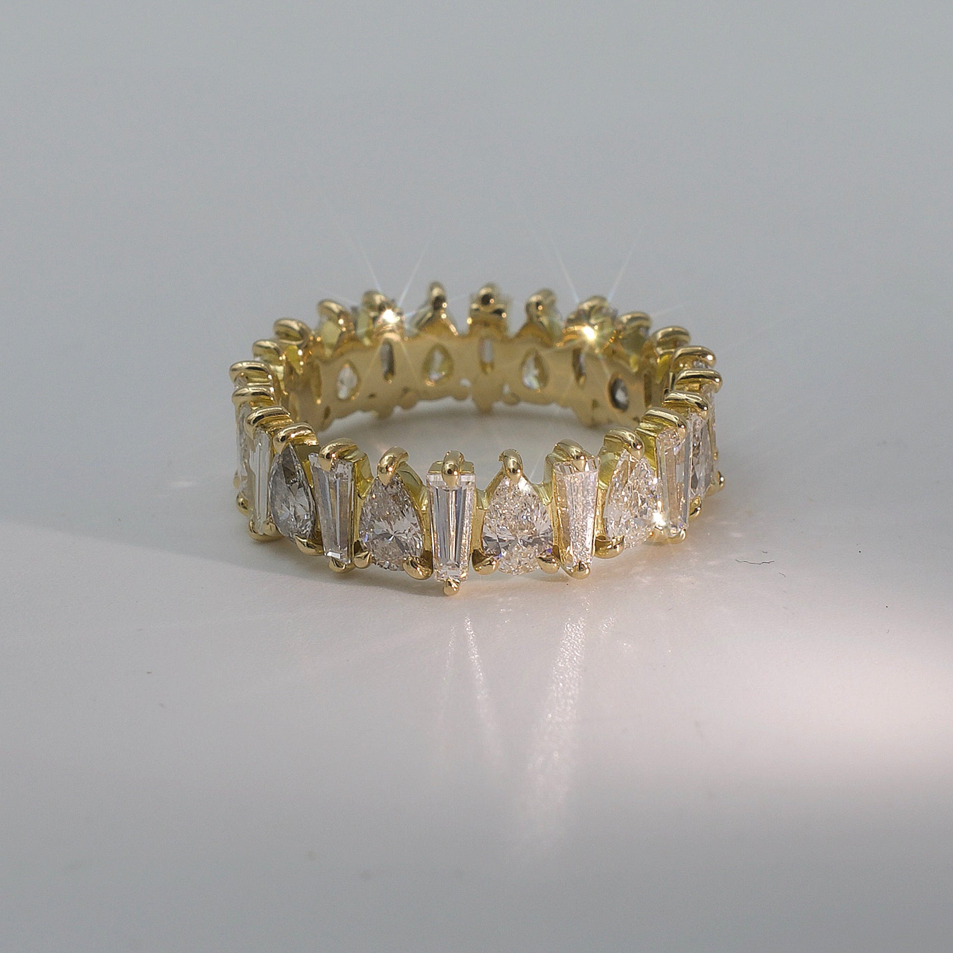 A harmonious blend of pear diamonds and tapered baguette diamonds make up this stunning wedding band. The diamonds cover the entire ring. A beautiful piece to be worn on it's own or paired with an open gallery engagement ring.