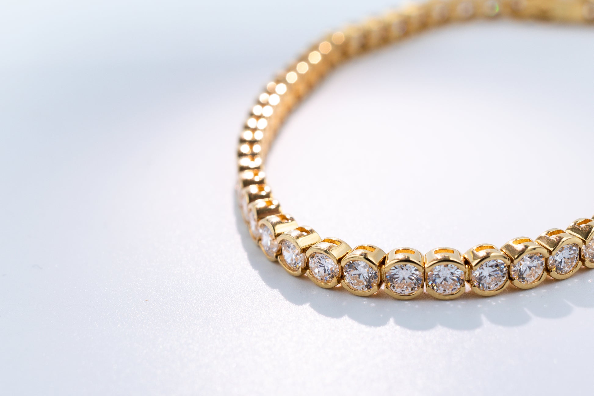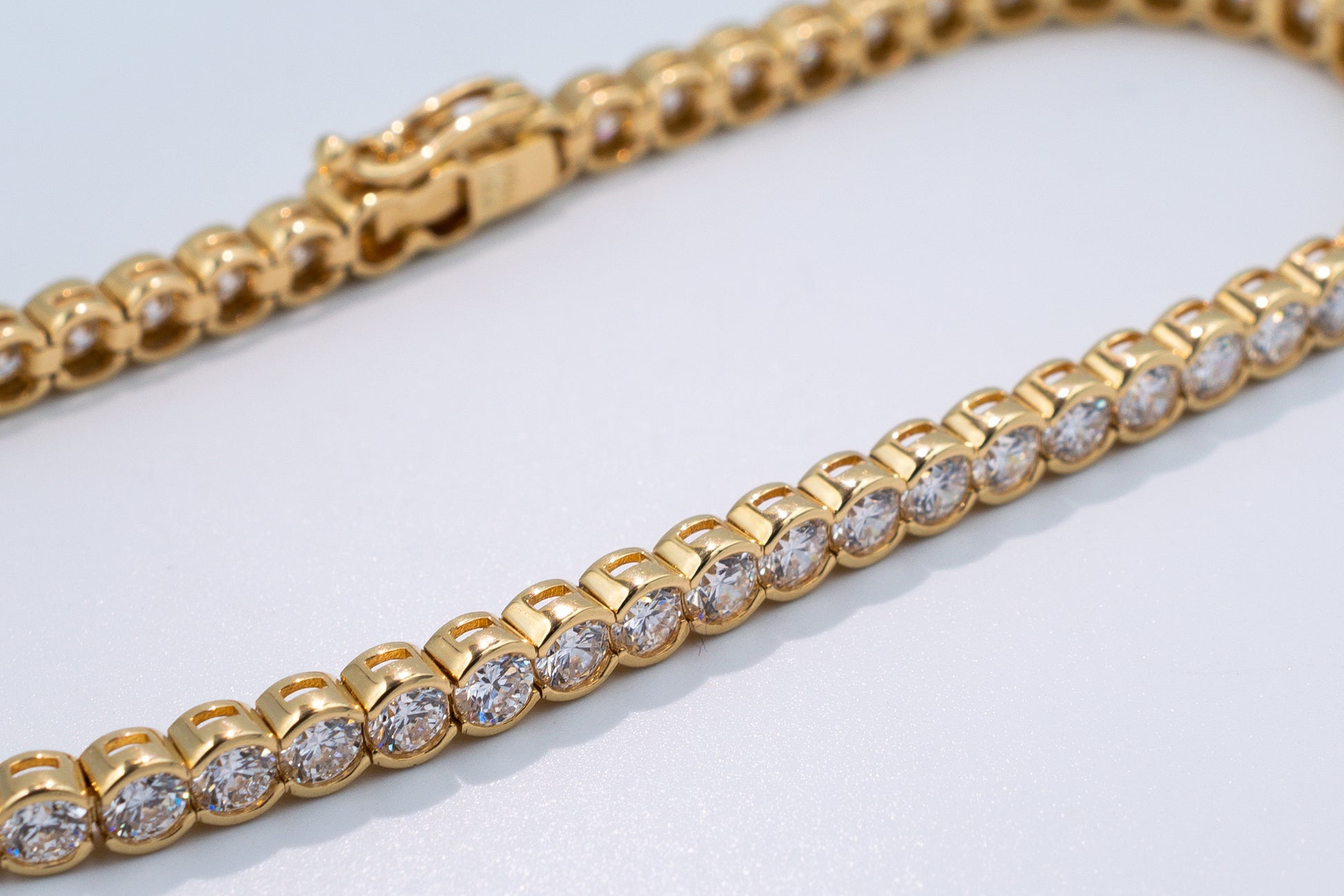 This modern tennis bracelet is crafted in 18K yellow gold and features a sleek half bezel setting, giving it a contemporary edge while highlighting the brilliance of each lab-grown diamond. Designed for both elegance and durability, it's a versatile piece perfect for everyday wear or special occasions.
