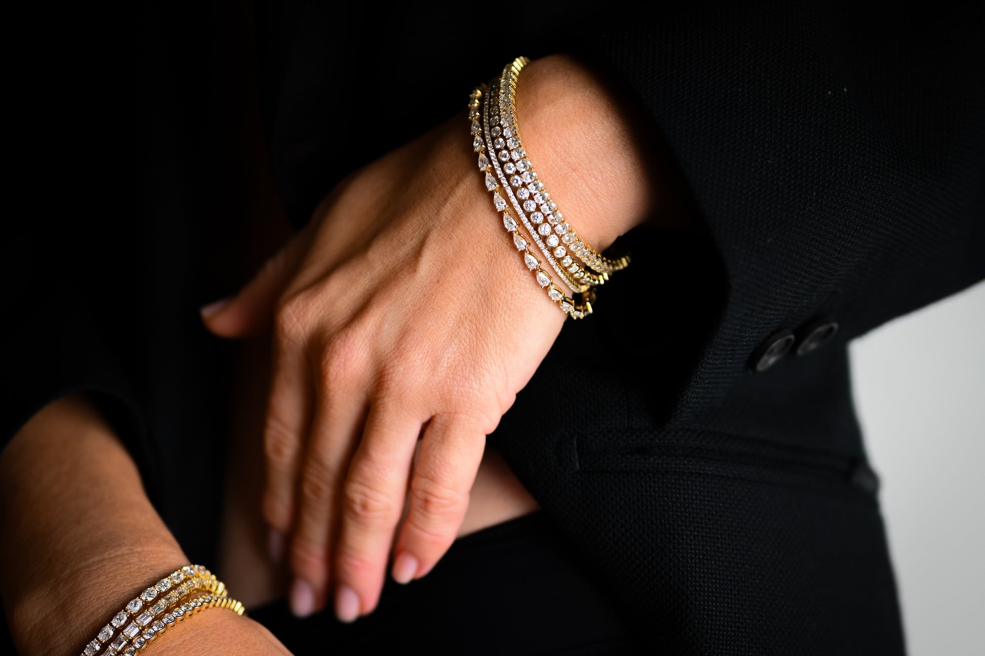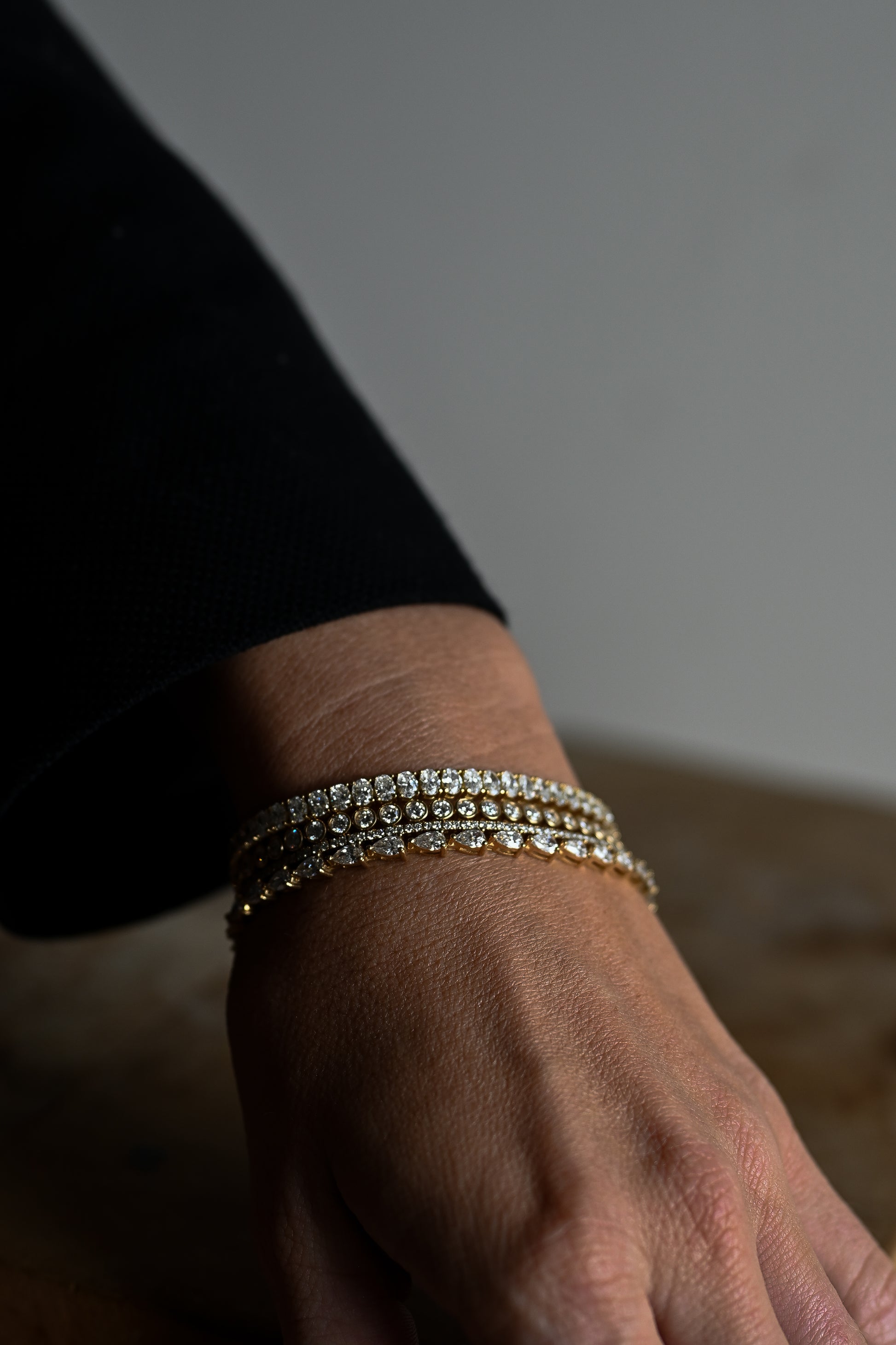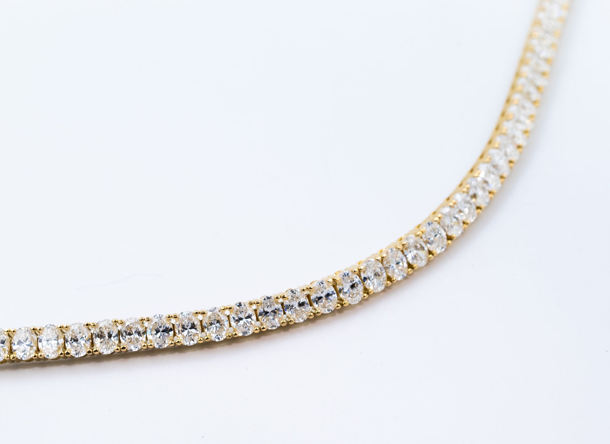 A timeless classic reimagined, this 18K yellow gold tennis bracelet features 56 oval lab-grown diamonds in a traditional setting. Each stone measures approximately 4.00 x 3.00mm and is expertly cut to maximise brilliance. With a total weight of 9.52 carats, this piece showcases diamonds of DE colour and VVS–VS clarity, offering elegant sparkle and enduring style. Designed in a classic silhouette and measuring 18.0cm in length, it’s the perfect statement of refined luxury.