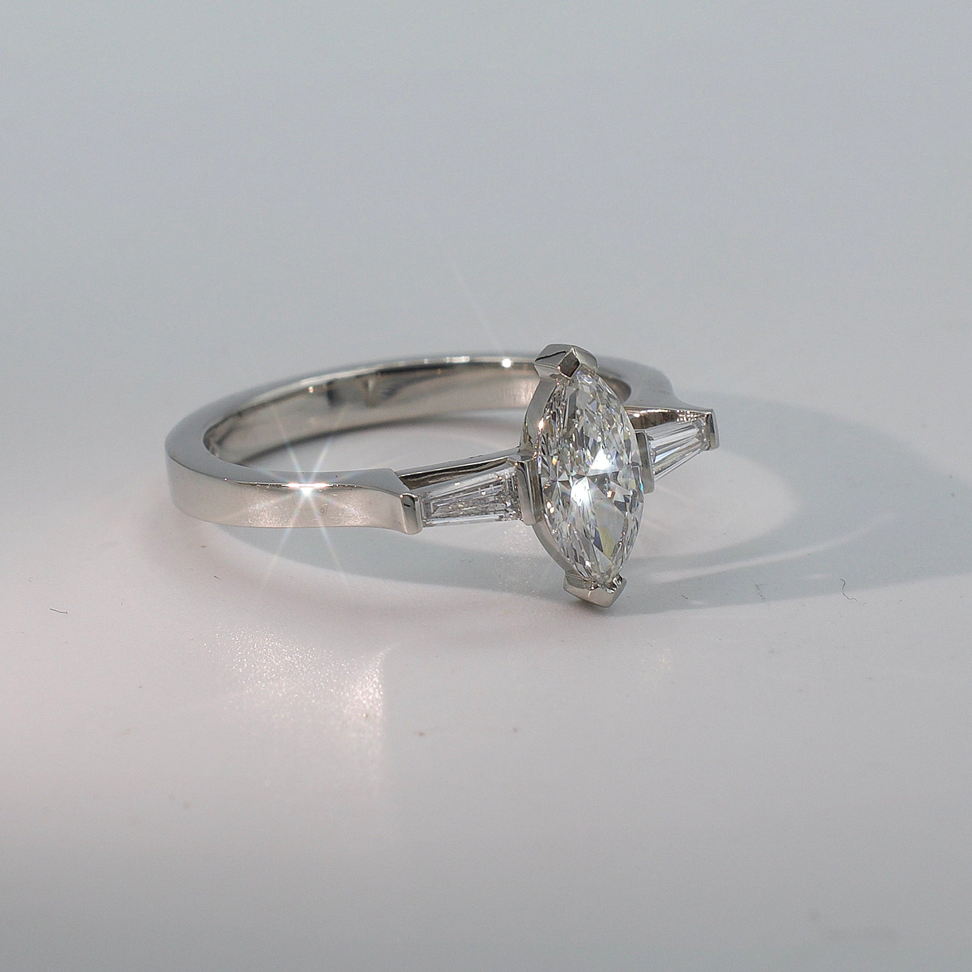 FEATURED STONE: 0.62ct marquise centre stone. 2=0.42ct tapered baguettes.